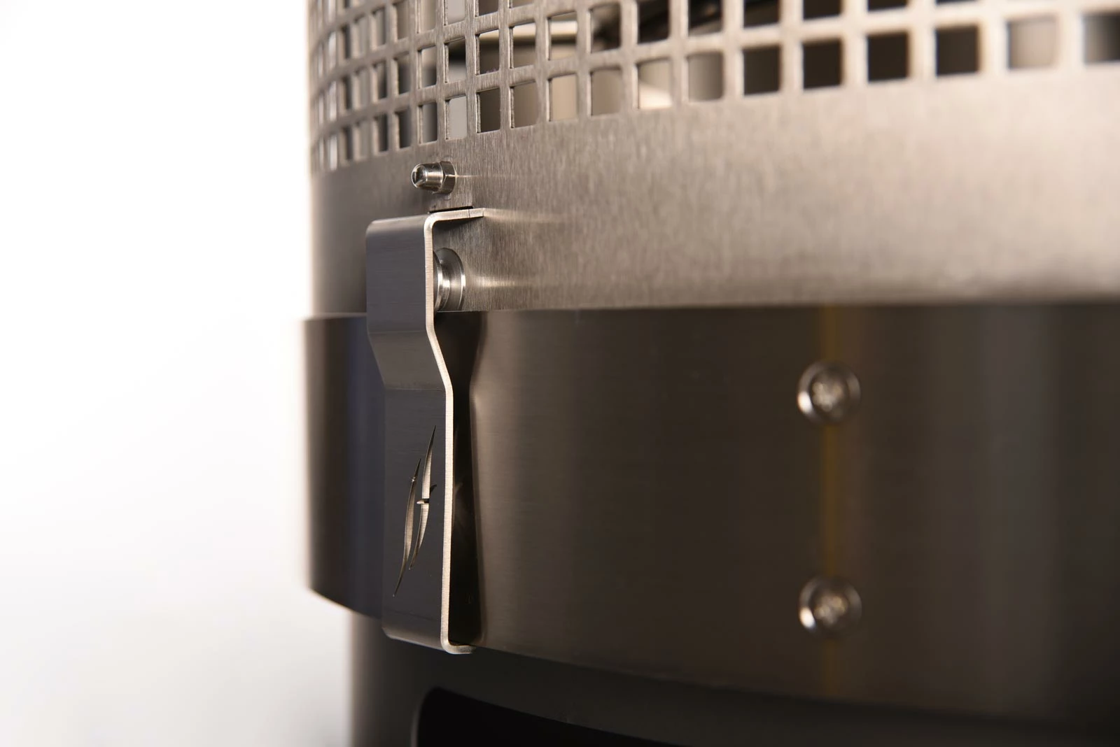 Eine Besonderheit bildet die 360° umlaufende Funkenschutztür. Wird der Funkenschutz nicht benötigt, lässt er sich leicht in den hinteren Brennraum verschieben. Die aus Edelstahl gefertigte Konstruktion verfügt über vier Rollen und kann problemlos verschoben werden. Die Tür ist mit vier Kugellagern ausgestattet und ermöglicht Ihnen ein komfortables und leichtgängiges Öffnen und Schließen.