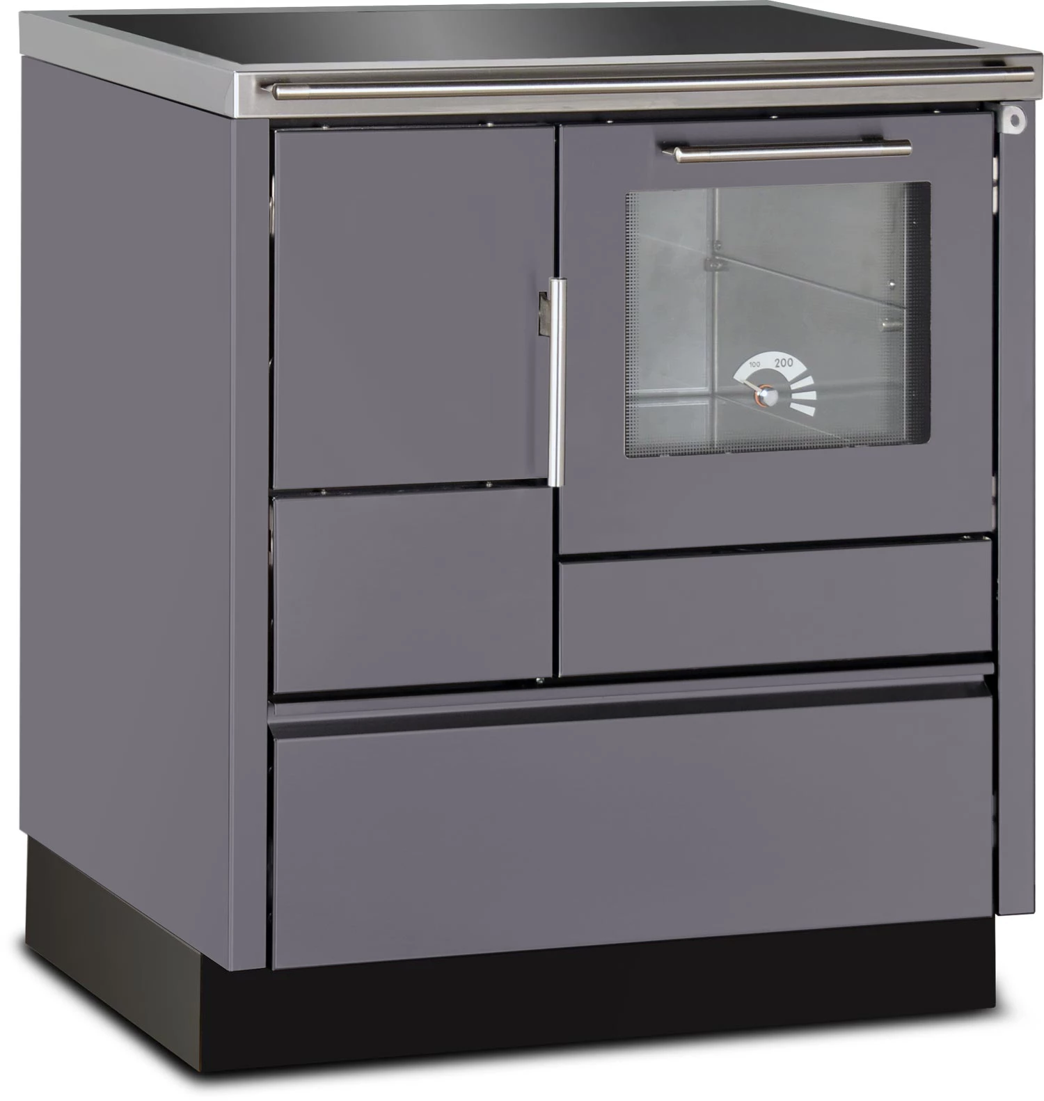 Schließlich wartet der Herd mit hitzeisolierten Edelstahlgriffen, einer Herdstange und einer großen Holzlade im Sockelbereich auf.