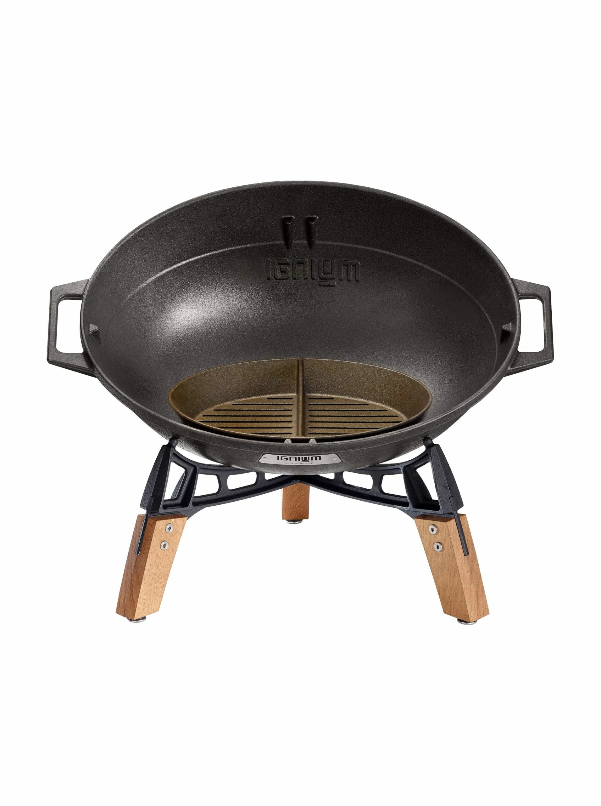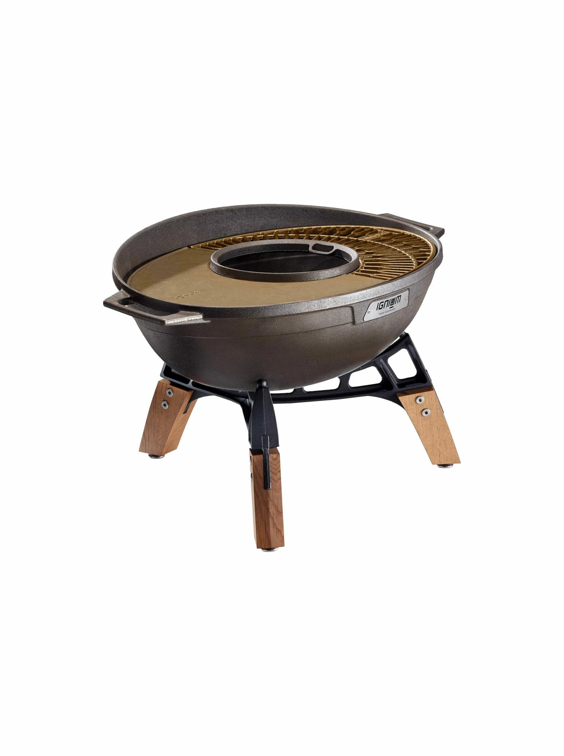 Die Verwendung von hochwertigem, recyceltem Gusseisen als Material für die Feuerschale ist ein weiterer Vorteil, da es eine ausgezeichnete Wärmeleitung und -speicherung ermöglicht. Des Weiteren sind die Füße aus regionalem Eichenholz gefertigt.