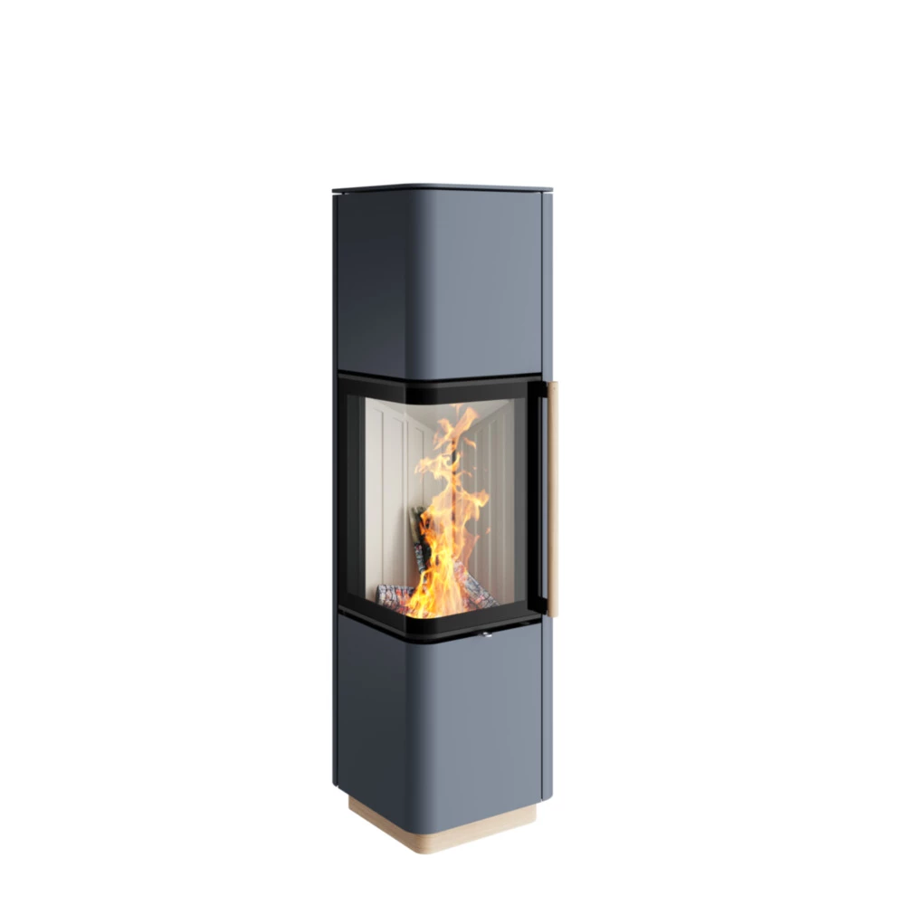 Die markante Eckform mit abgerundeten Kanten und die modernen Holzdetails an Griff und Sockel verleihen diesem Schwedenofen eine einzigartige Ausstrahlung. Die großzügige Ecksichtscheibe ermöglicht einen unverstellten Blick auf das faszinierende Flammenspiel.