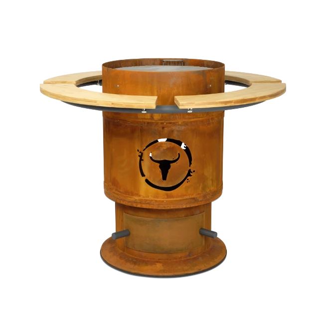 Der MOESTA BBQ Bandit Fireplace ist ein echter Hingucker im Garten. Gefertigt aus hochwertigem, robustem Cortenstahl und mit liebevollen Details versehen ist die Feuerstelle ein toller Platz zum gemütlichen Zusammensitzen – im Sommer wie im Winter. Die charakteristische Patina verleiht zusätzlich Schutz davor, dass Rost in das Material eindringt. So bleibt Ihnen Ihr Bandit lange erhalten. Der Stierkopf auf dem Korpus ermöglicht einen tollen Blick auf die Flammen. Richtig praktisch ist die Ascheschublade: Durch einen Trichter gelangt die Asche in eine Schublade. Diese lässt sich komplett rausziehen und anschließend entleeren.