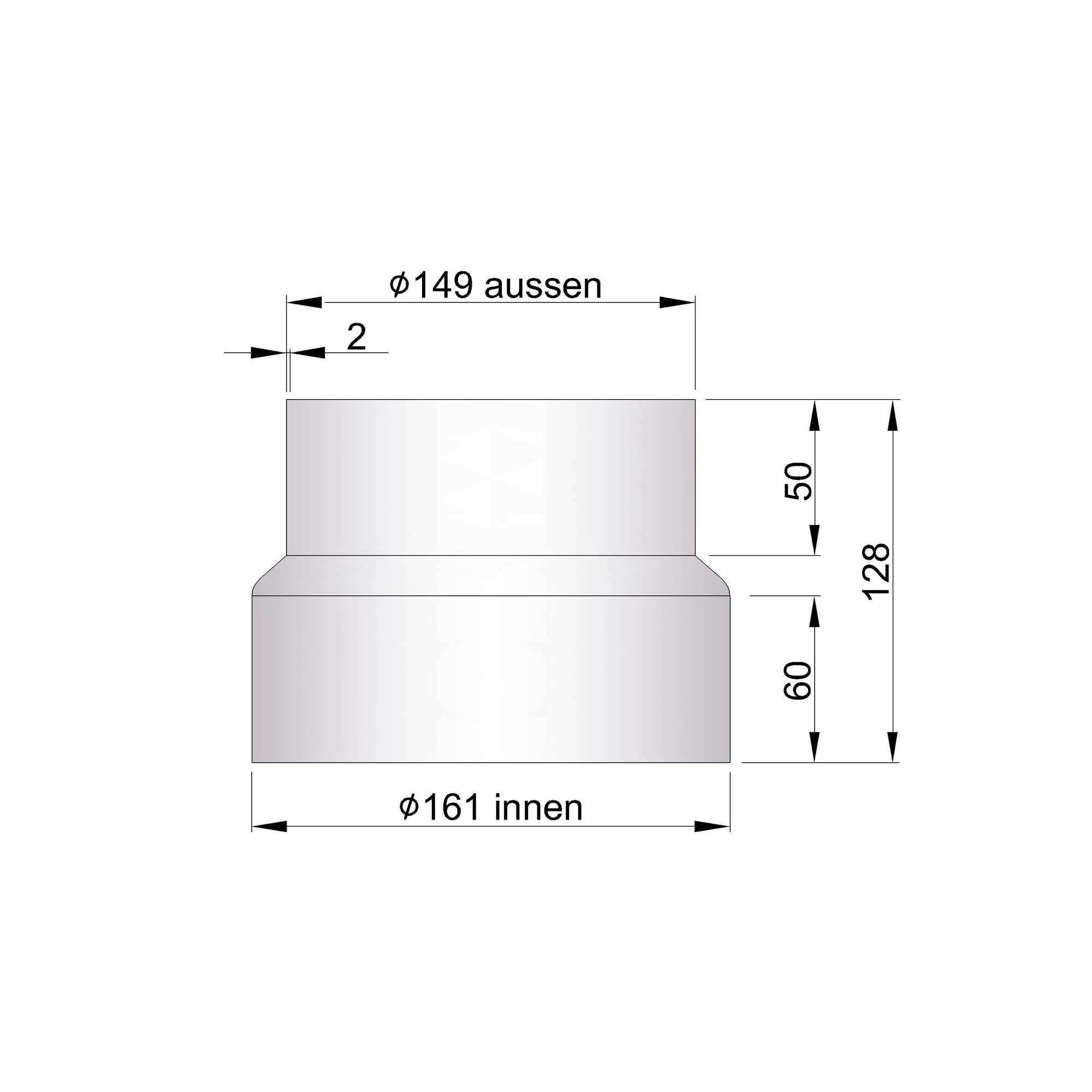 | Durchmesser | 150 mm eng auf 160 mm weit, 150 mm eng auf 200 mm weit, 160 mm eng auf 180 mm weit, 160 mm eng auf 200 mm weit, 180 mm eng auf 200 mm weit, 200 mm eng auf 250 mm weit |